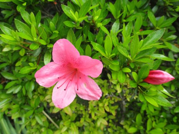 新緑にサツキの花の鮮やかなピンク色が綺麗な朝です