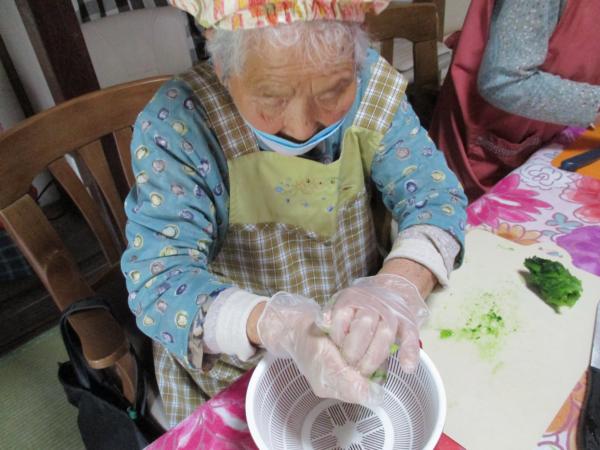 茹でた小松菜は、カットしてから絞りますほっとした顔