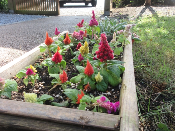 玄関先の花壇では、鶏頭の花と