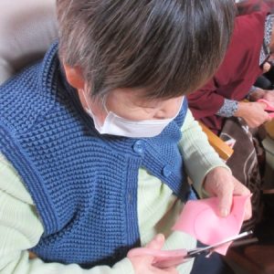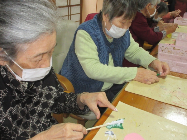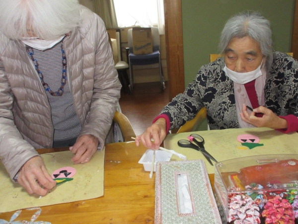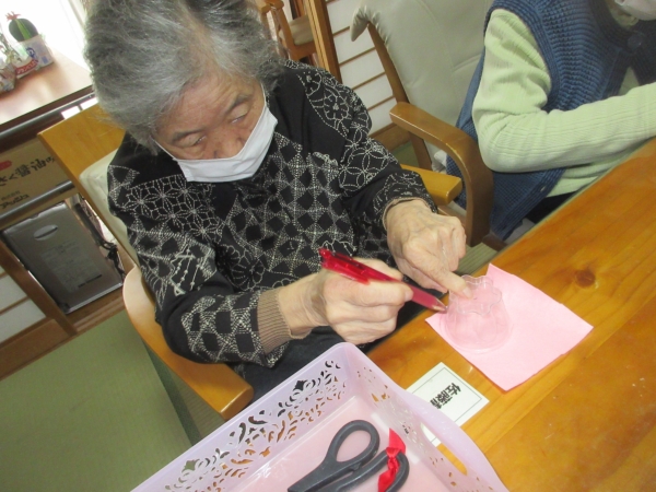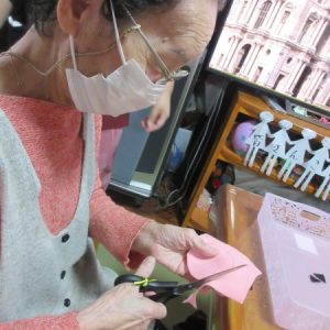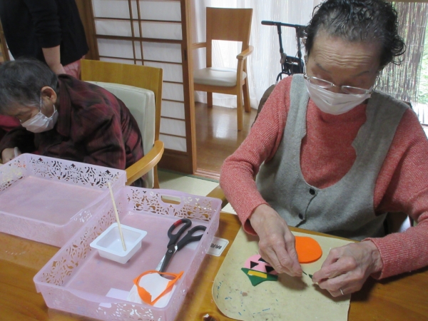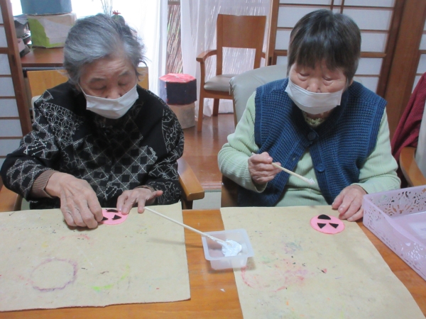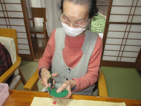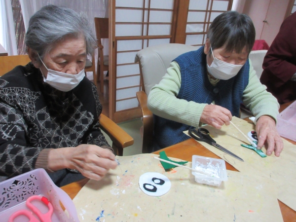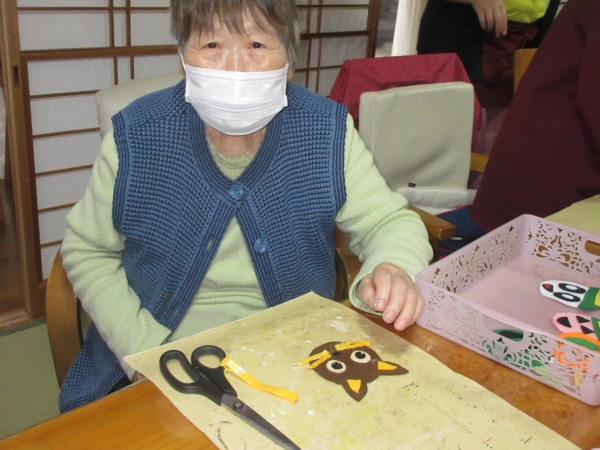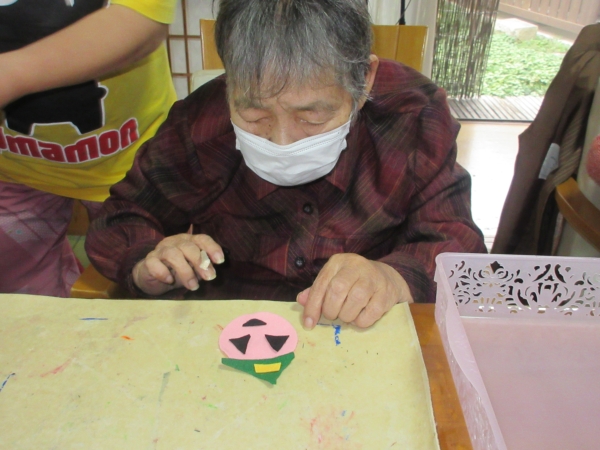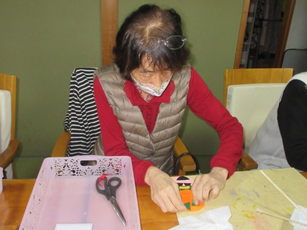 位置が決まった母は、迷わず目と口を貼りつけています。