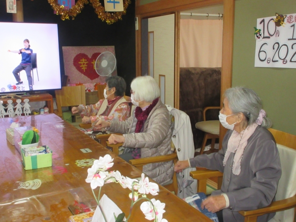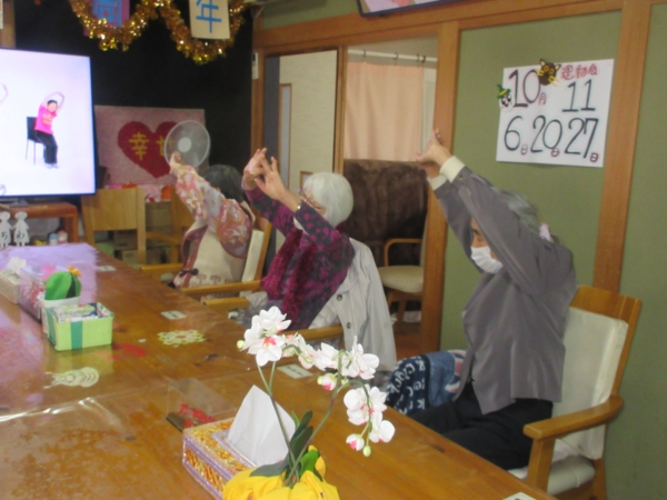 大型テレビ画面を見ながら体操をします
