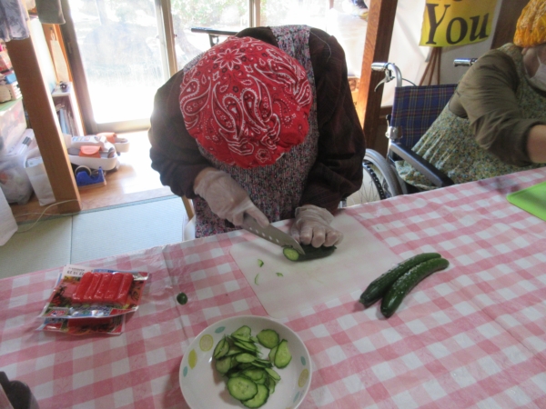 キュウリは輪切りに薄くスライスします