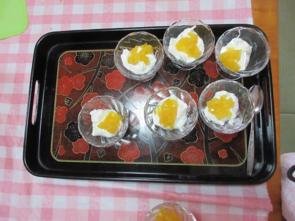 ヨ-グルトに桃缶を添えます