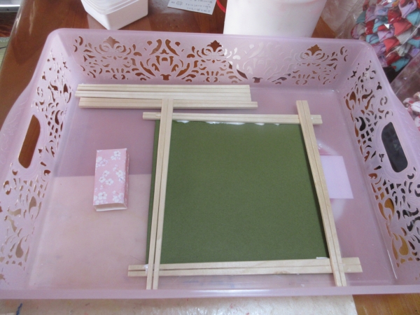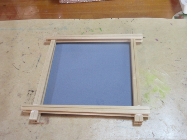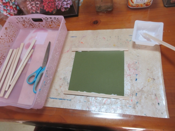 枠組の下に、先ほどカットした色紙をボンドで貼っていきます。