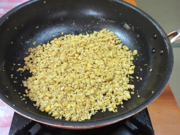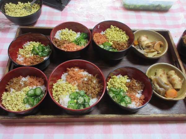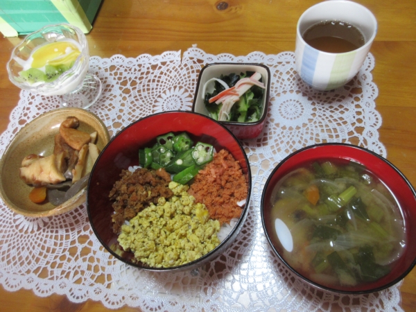 🥢4色丼(炒り卵、鮭フレーク、そぼろ、オクラ)