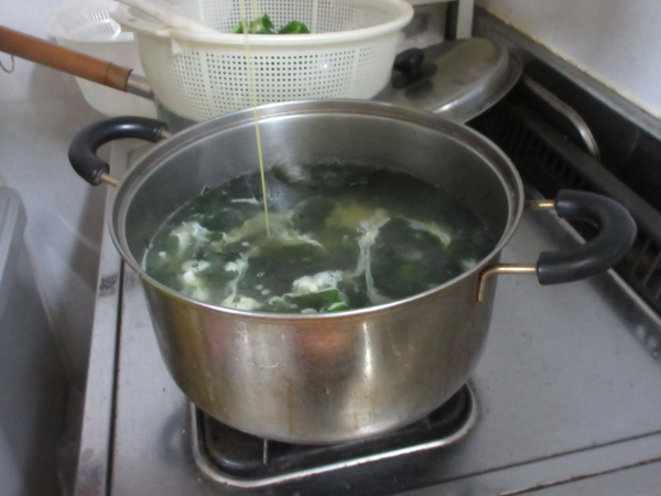ワカメの中に溶き卵を流し入れてスープを作っていきます。