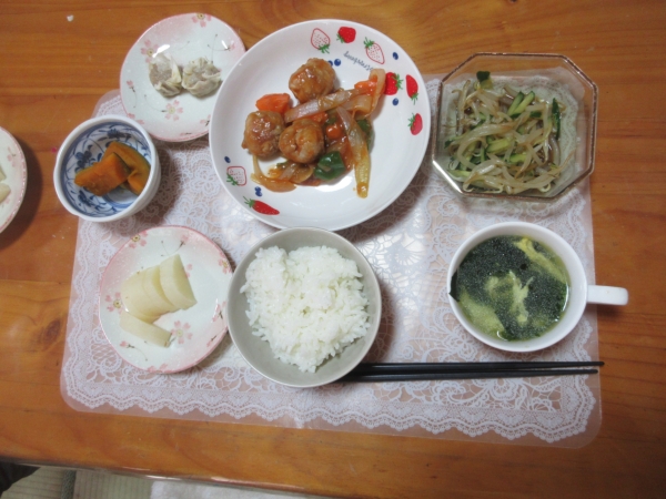 今日の主役、酢豚の盛り付けも完成。