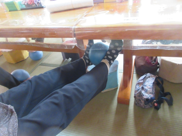 テーブルの上で毬つきをします。