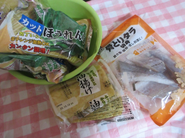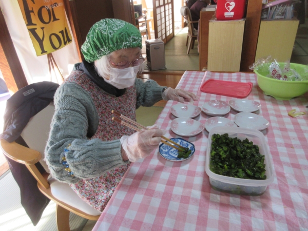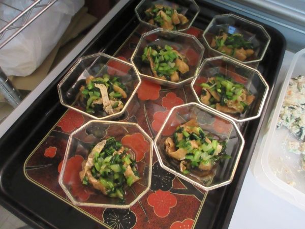 油揚げは、短冊切りにして茹でた小松菜でおひたしを作ります。