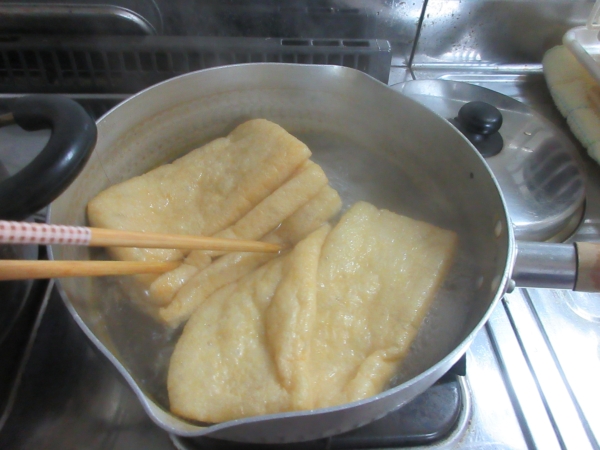 おひたしにする油揚げは、お湯でサッにくぐらせます。
