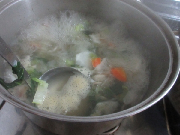 味噌汁は、野菜が煮えたら、丁寧にアクをとってから味噌を加えていきます。