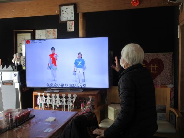 「リウマチに効くように」と張り切って体操を行う9●歳の母。