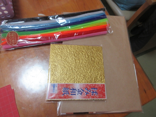 巻き付けてクルクルしたクラフト紙を円にしてモールで止めます。