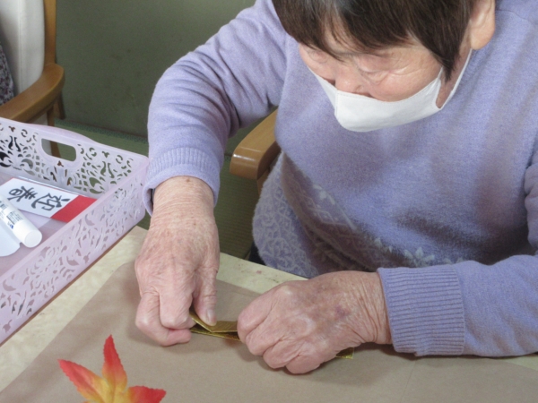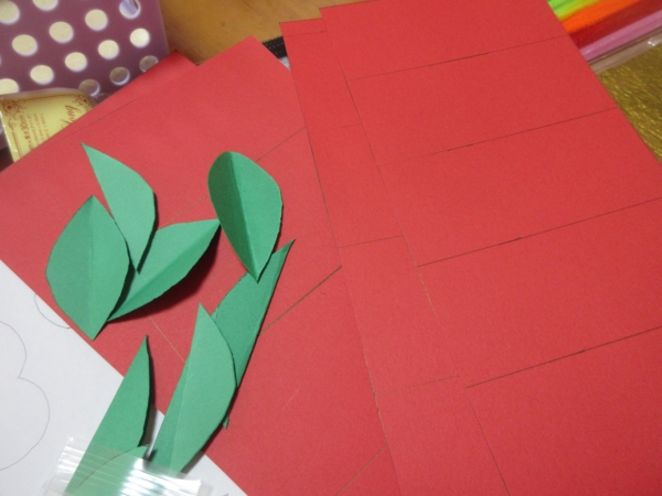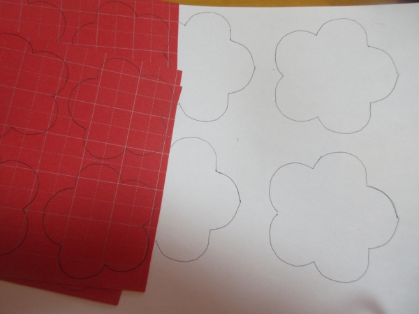 紅白の梅を貼り合わせ、葉っぱを付けます。