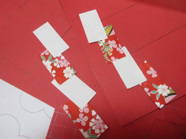 御幣(ごへい)というパーツを赤い折り紙と白い折り紙で作ります。