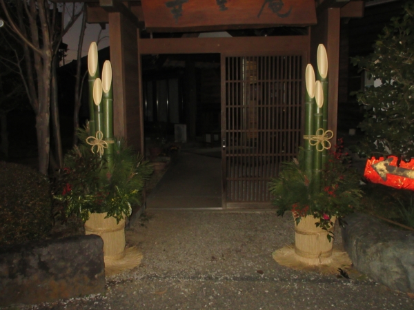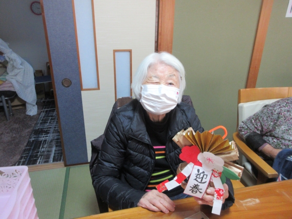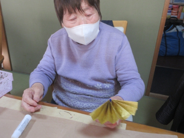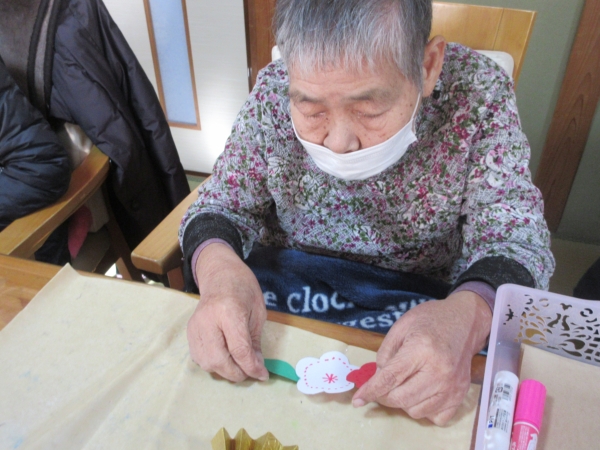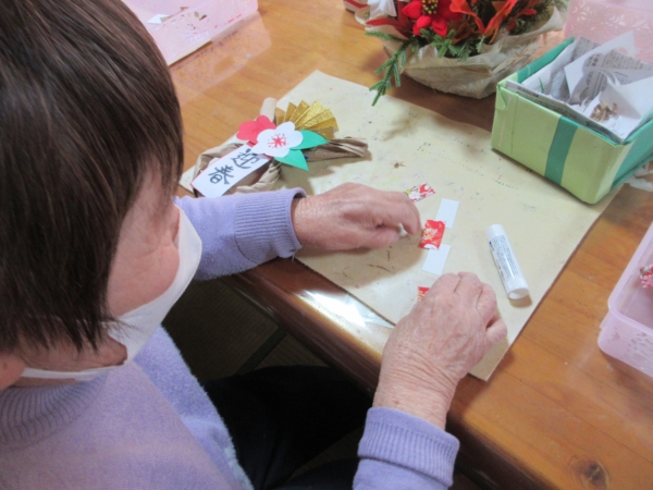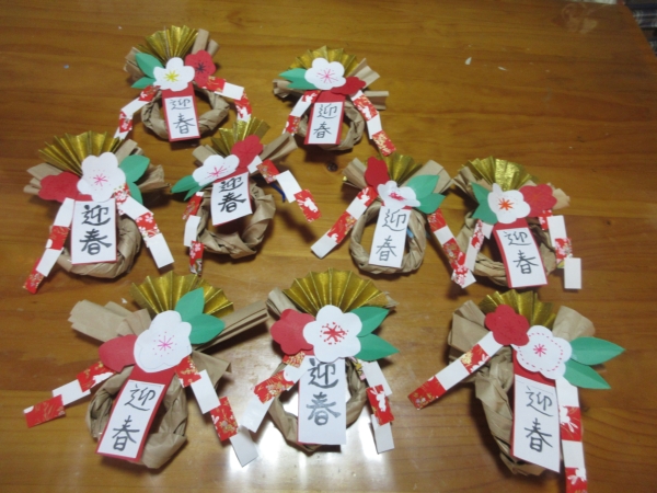梅の花と「迎春」を円にしたクラフト紙に貼ります。