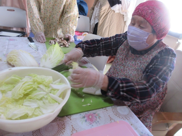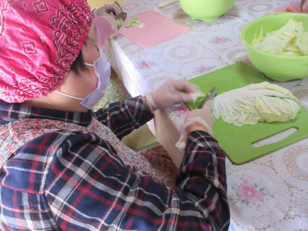 白菜は、大き目で切っても小さくなるので、大きく切り込みをいれます。