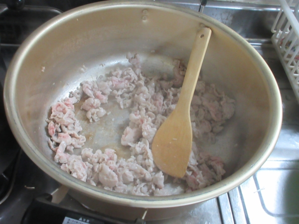 次はお肉を炒めていよいよ、中華丼を作ります。