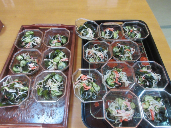 付け合わせの酢の物はきゅうりとワカメとカニカマ