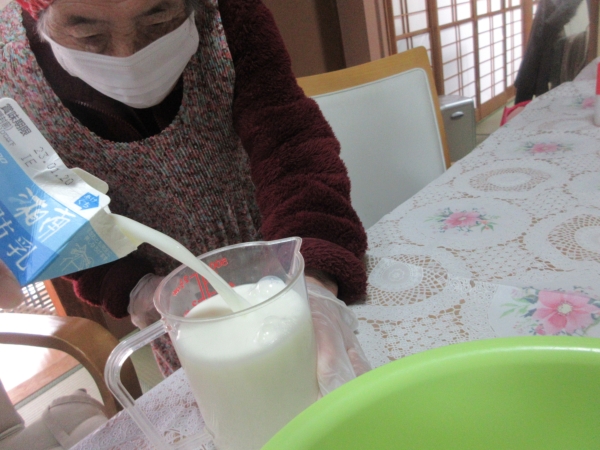 お砂糖を入れ、牛乳も入れます
