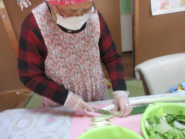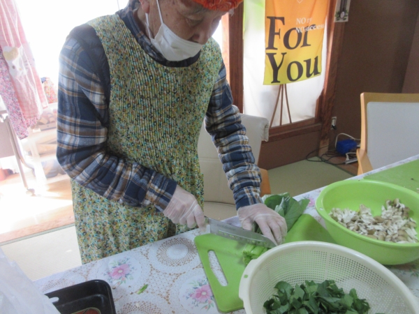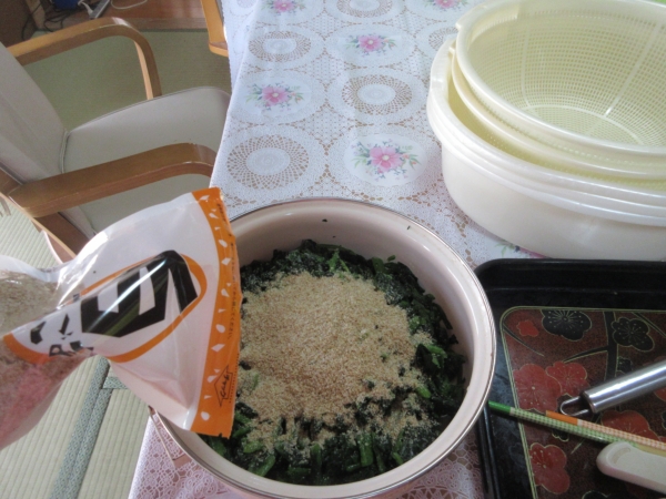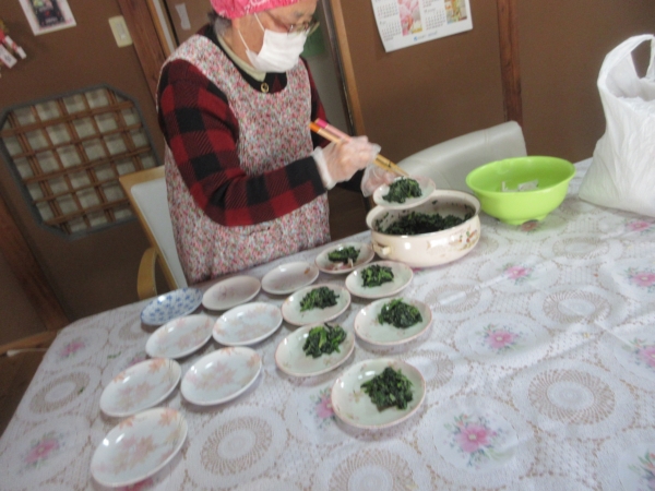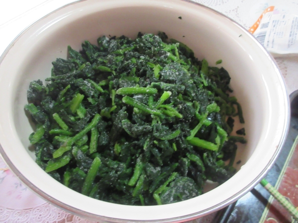 ほうれん草にごまなどの調味料を入れ、胡麻和えを作っていきます。
