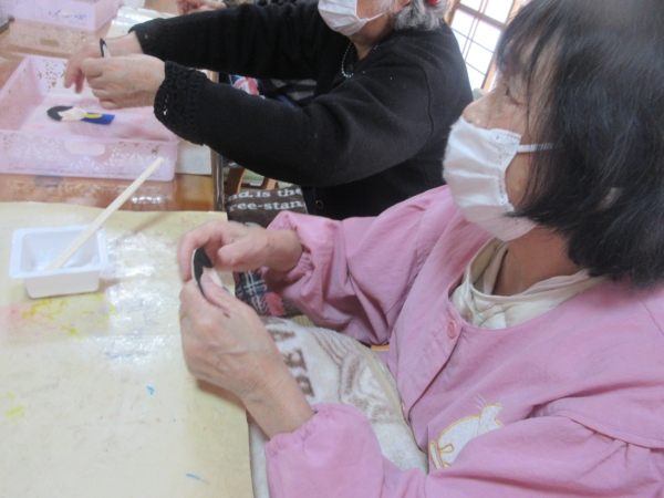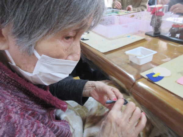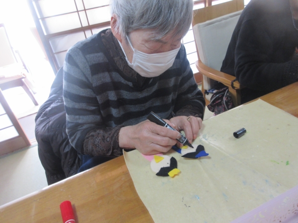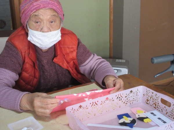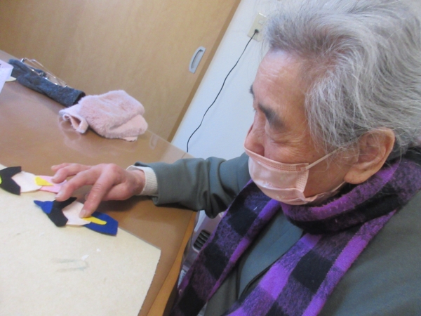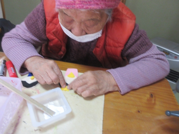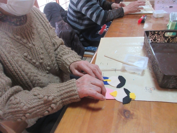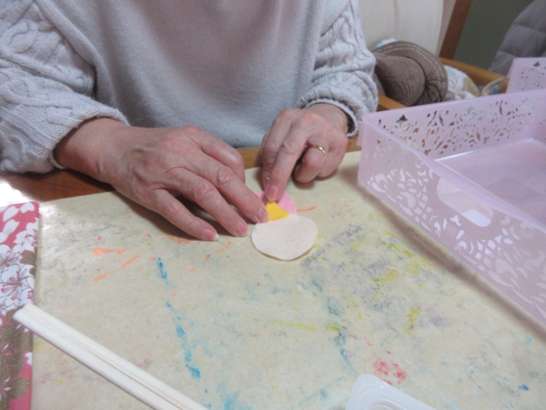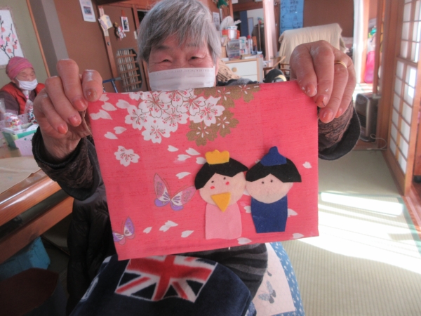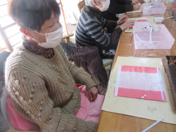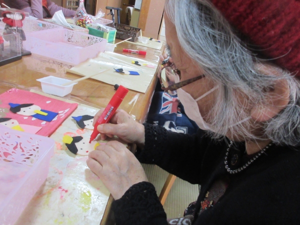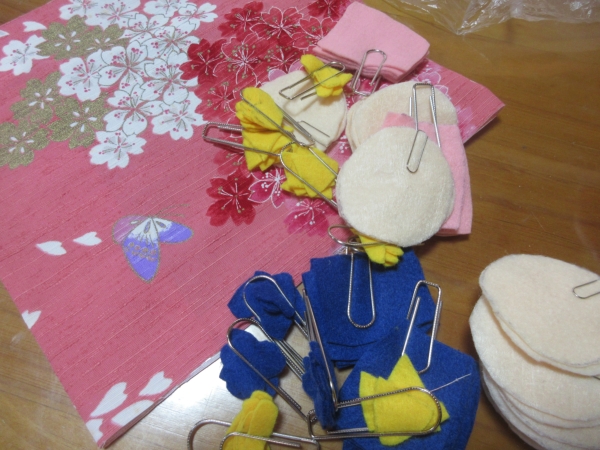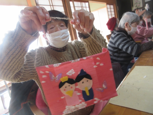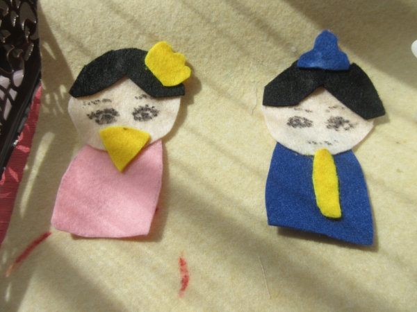 通し終わったら、お雛さまとお内裏様を台紙に貼りつけます。