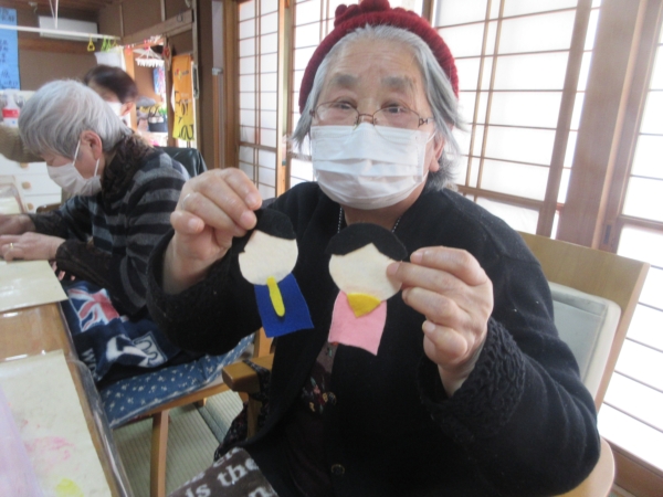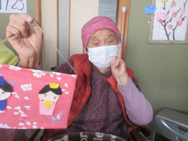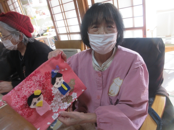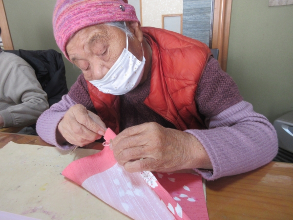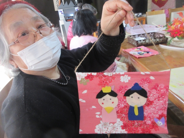 母達が笑顔で完成したタペストリーを見せてくれます。