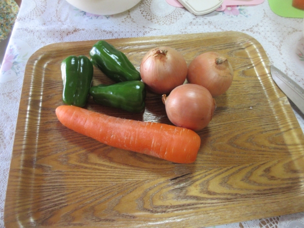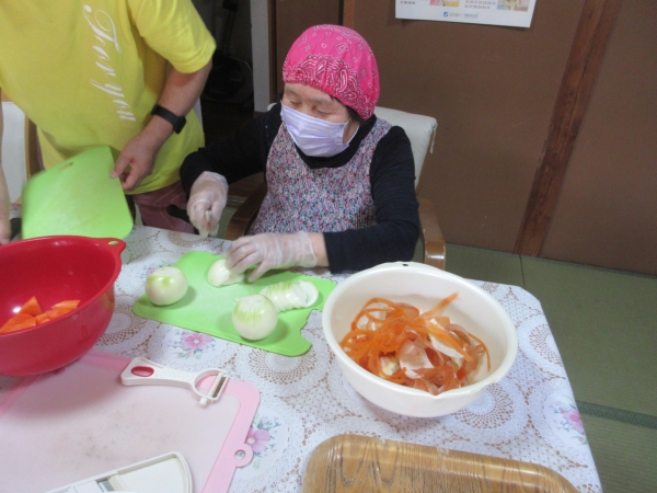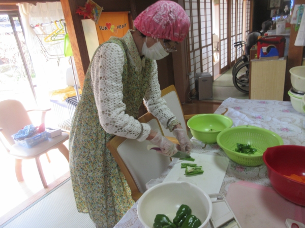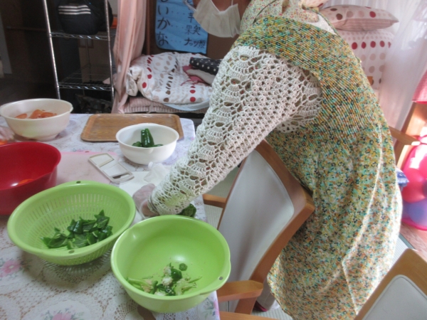 ピーマンは乱切りね、と言い、種を取って手際よく切って行きます。