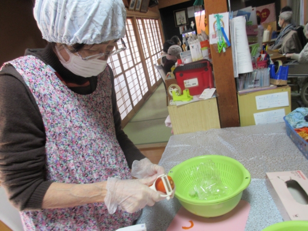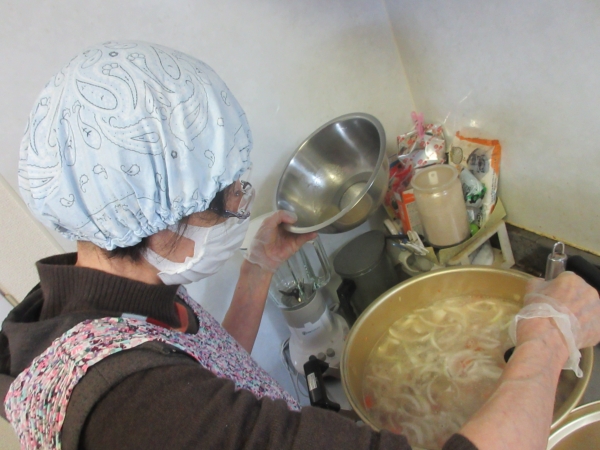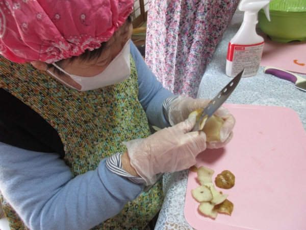 エプロン・グローブ・三角巾をかぶり、消毒をして始めます。