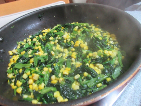 ほうれん草はコーンと一緒にバターで炒めます。