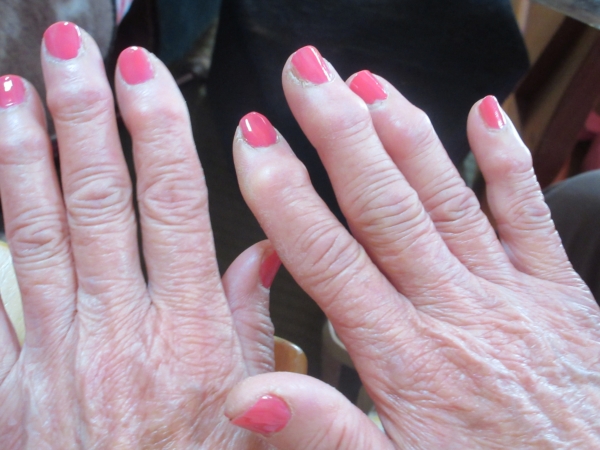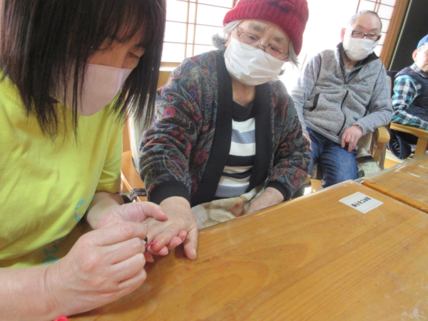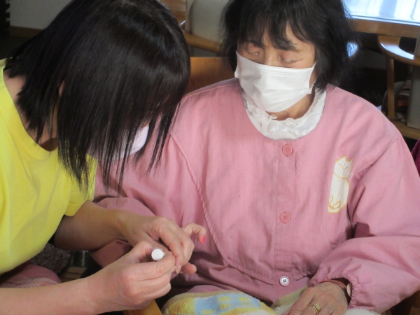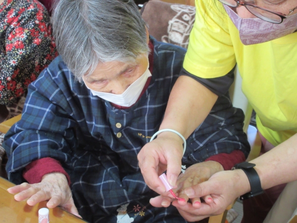 マニキュアを塗ってるところを真剣な眼差しでみている母達。