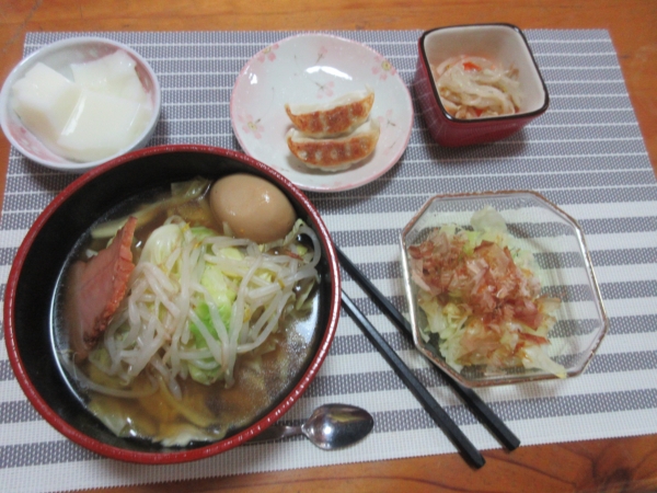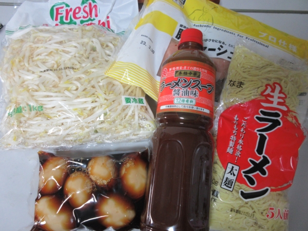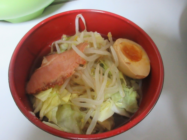 麺、野菜、煮卵、チャーシューを盛り付けつゆを注いだら醬油ラーメンの出来上がり。