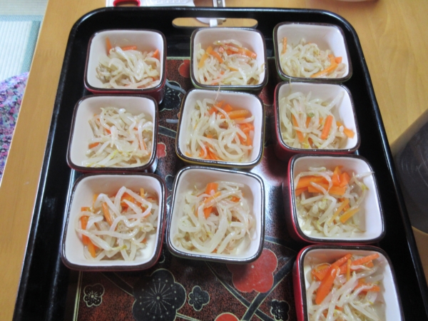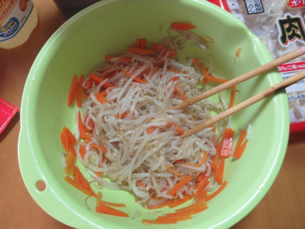 もやしと人参に調味料を入れ混ぜ混ぜします。