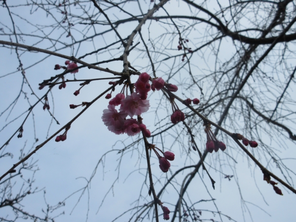お庭の枝垂桜がチラホラと咲いてきました、春のおとずれがもうすぐそこです。