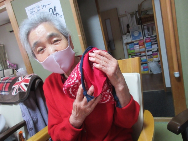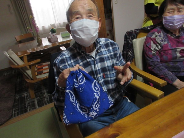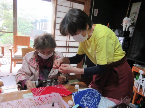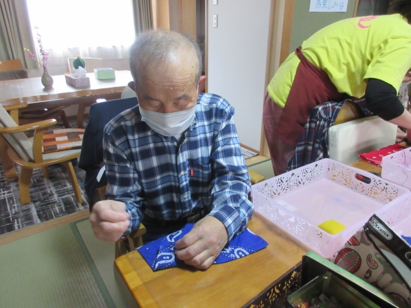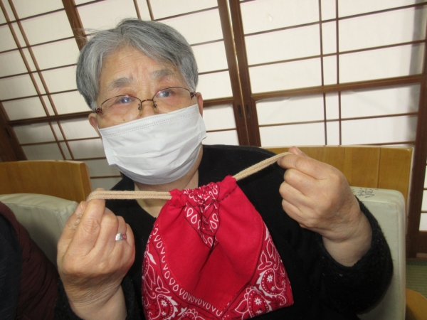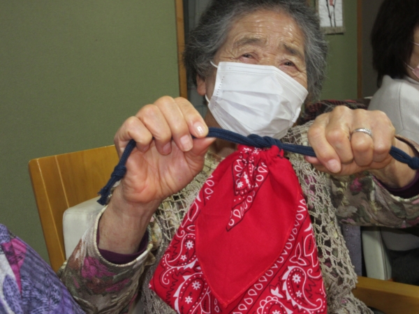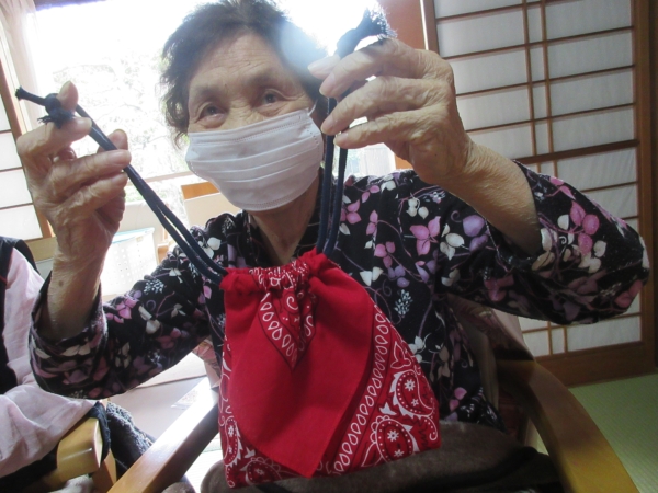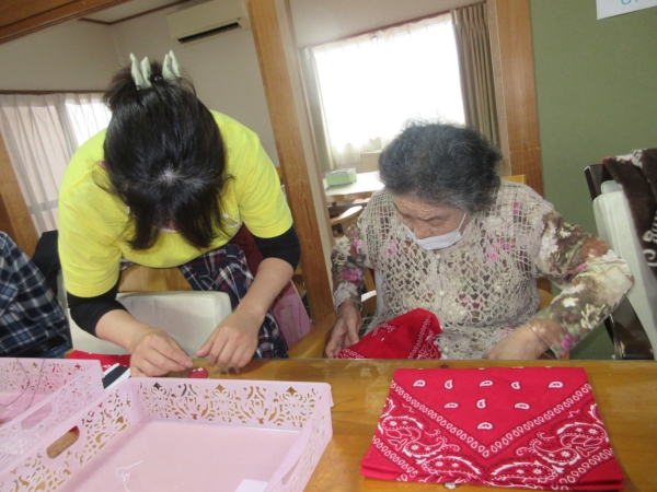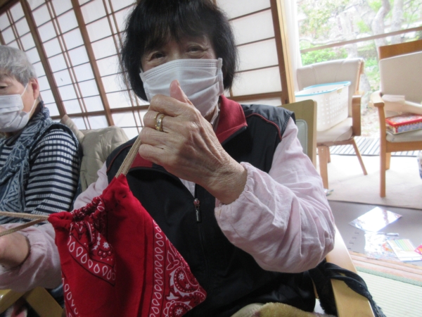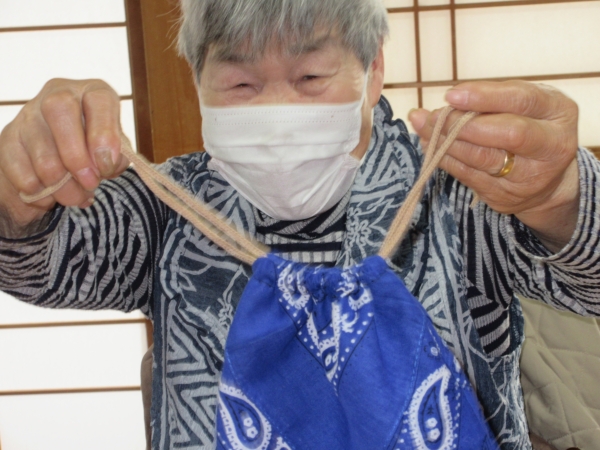 本日のメインレクリエーションは手縫いをして巾着を作ります