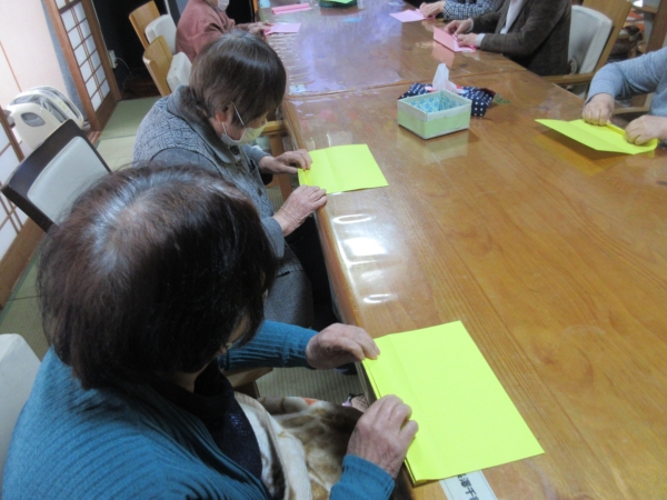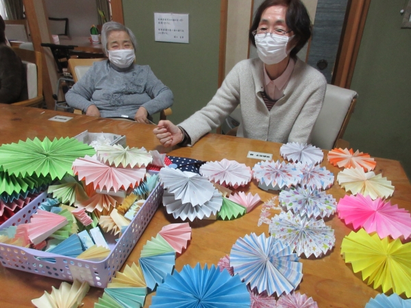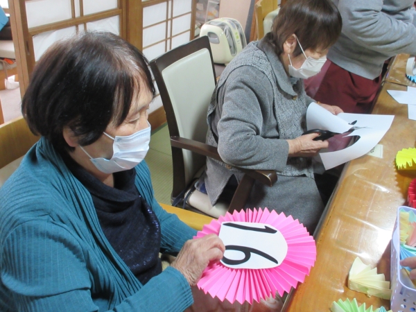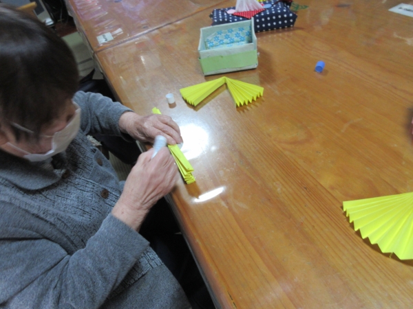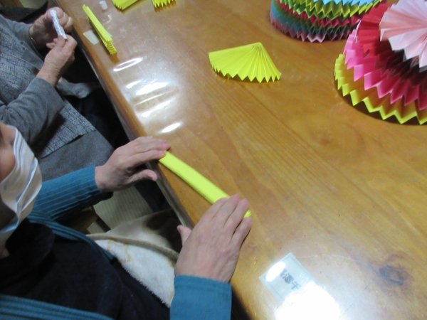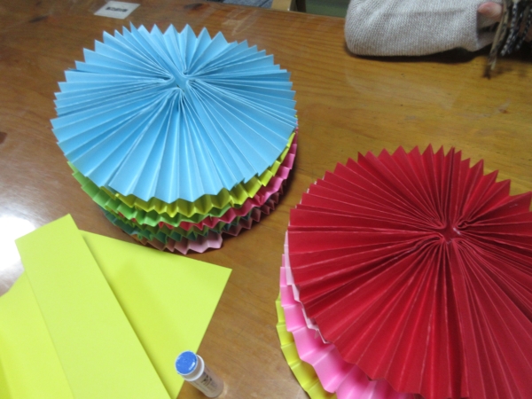 母がジャバラに折った色画用紙を糊で貼りつけ、円の形にしていきます。