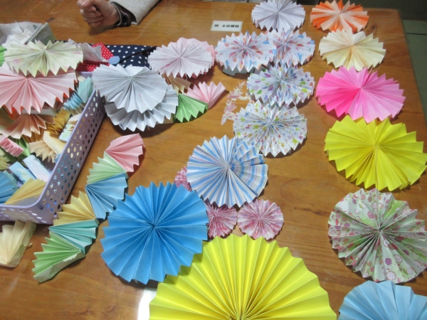 色画用紙をジャバラに折り、扇子の形を沢山作って行きます。