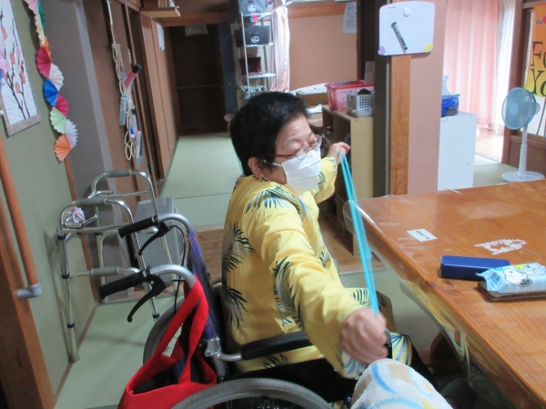 転倒予防に足でもゴムを使って体操しましたよ