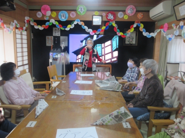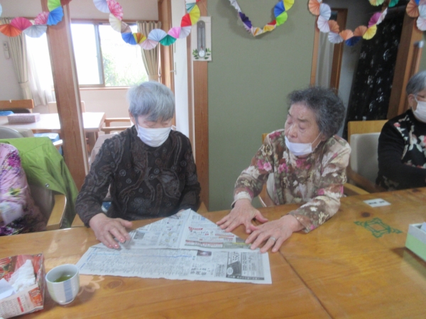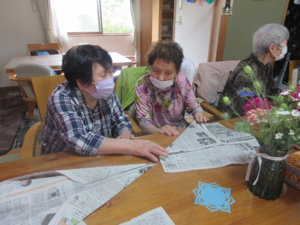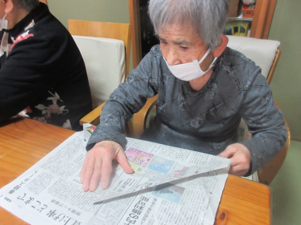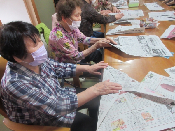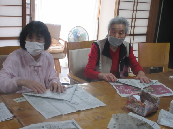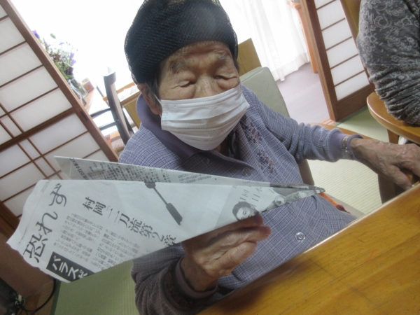 午前レクリエーションは、新聞紙を使った紙飛行機作りをしました。