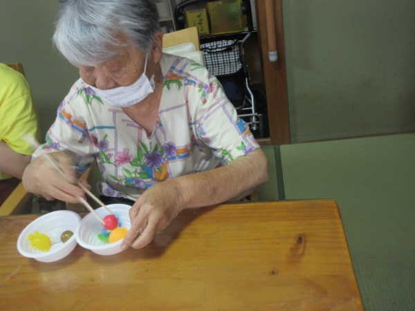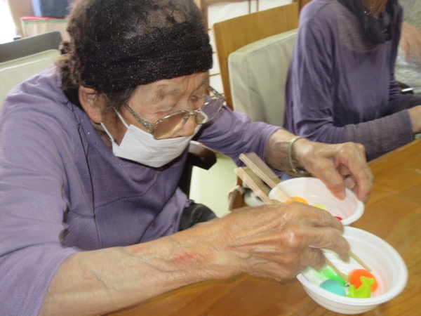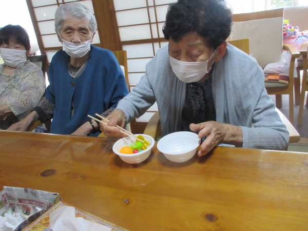 お箸で挟んで移し替えて、次の方へとリレーするゲームを行いましたdouble exclamation