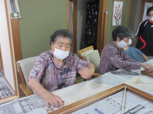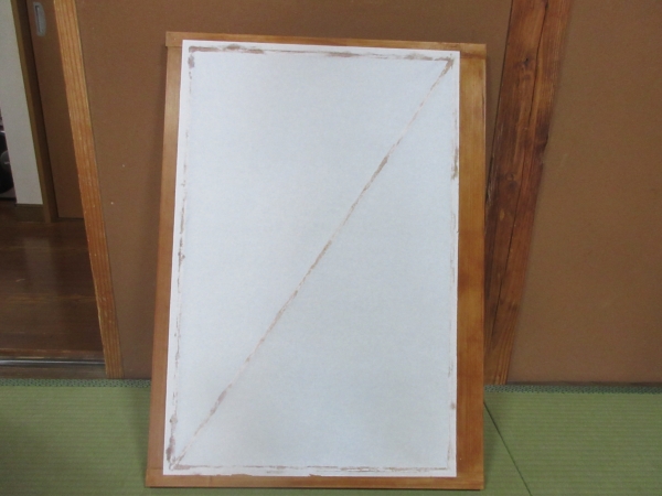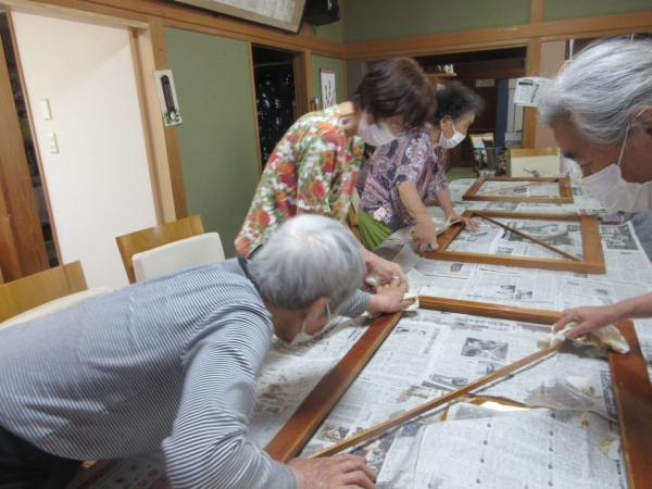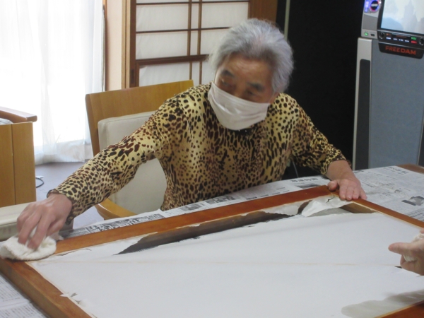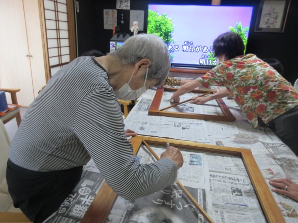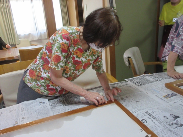 丁寧に糊付けをしたら、障子紙を貼って乾かします。