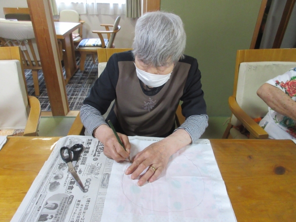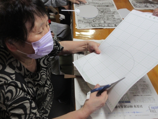 先ずは、厚紙をうちわの形に切って型紙を作ります。
