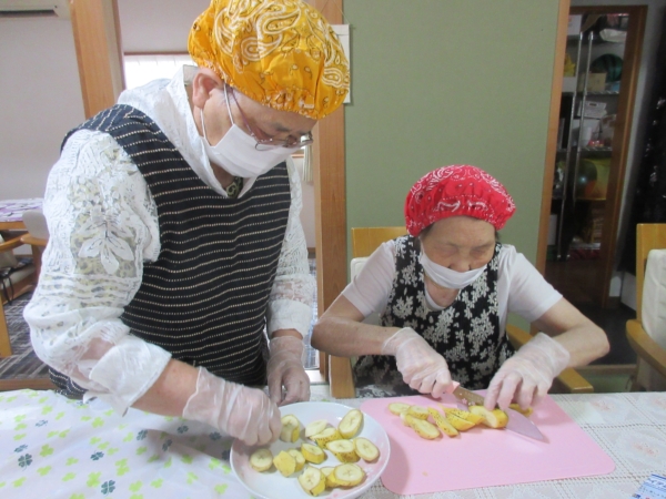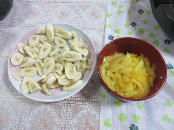 バナナの型崩れを防ぐ為に皮ごとバナナを切って頂きました