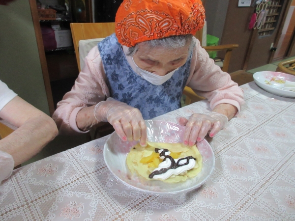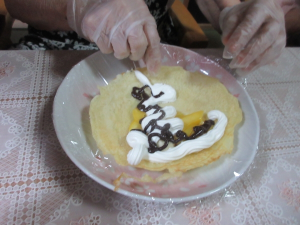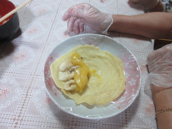 食べやすいようにクルクル…と巻いたら、チョコバナナクレープの完成で~す