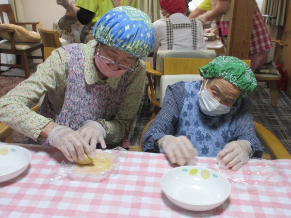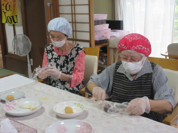 あんこ玉をラップに置き、もち米をのせてあんこで包んでいきましょう