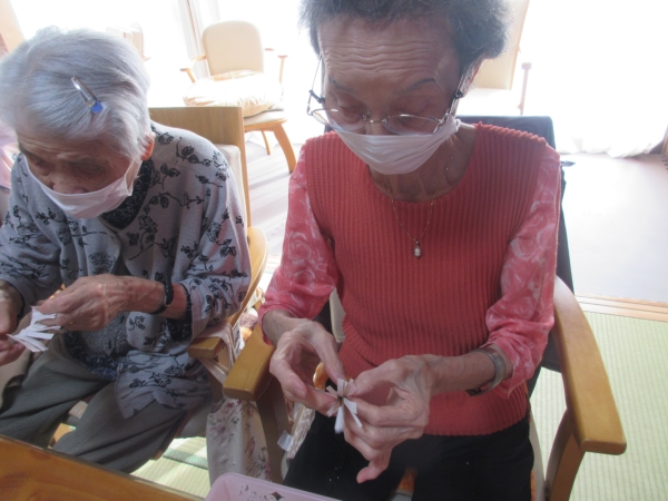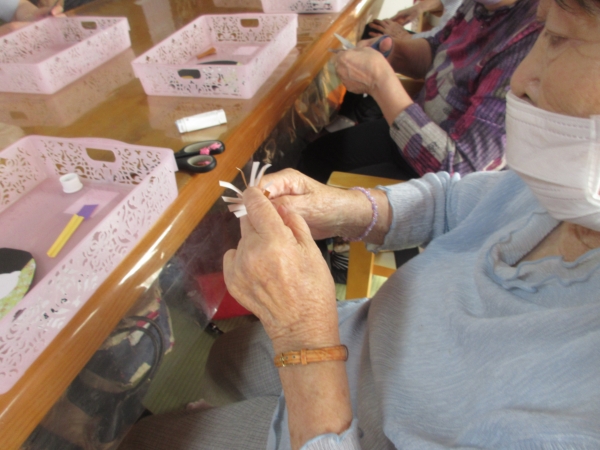 折り紙を細く折って、クルクルと巻くとすすきの穂の出来上がり