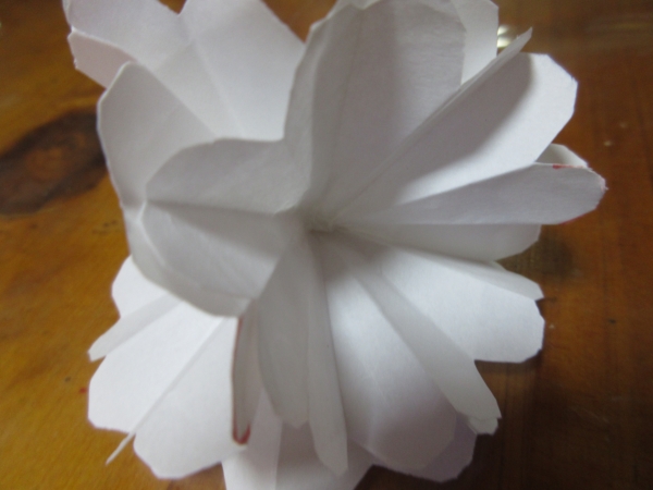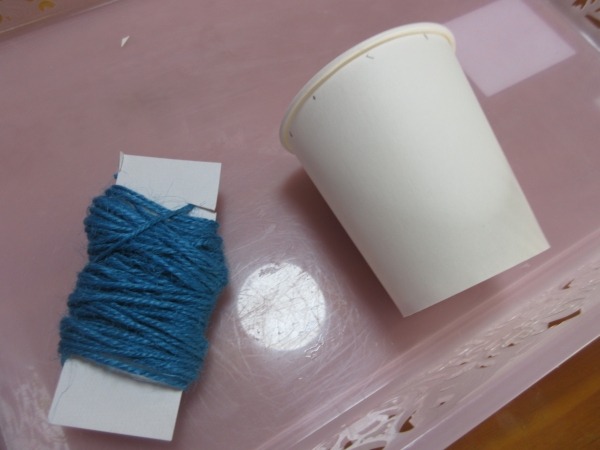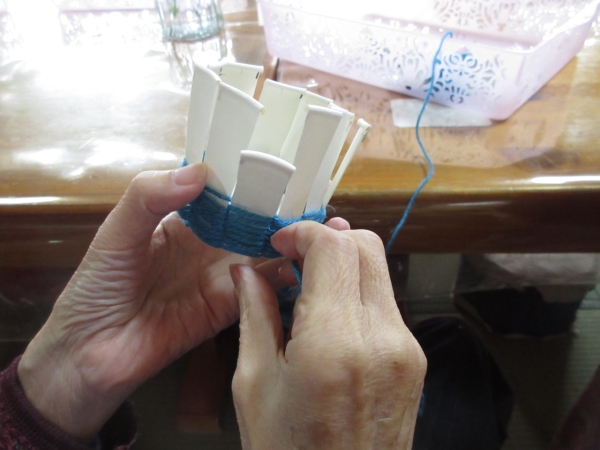 今度は、麻ひもを紙コップに交互に編んで行きます