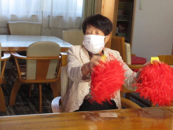 赤、白、黄色、青のポンポンを持って元気に身体を動かして