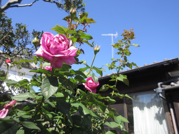 幸せの幸望庵に咲く、綺麗なバラも青空に負けず