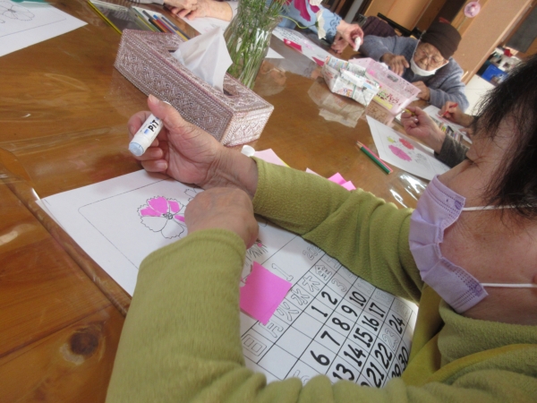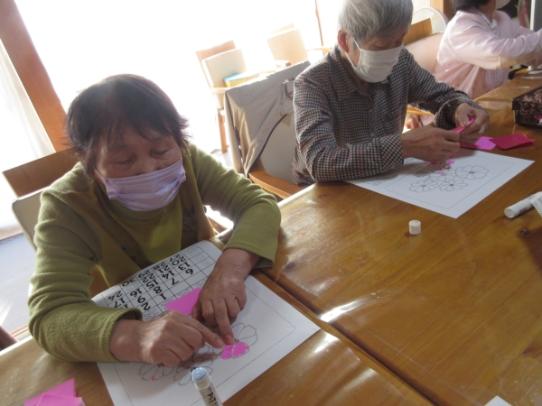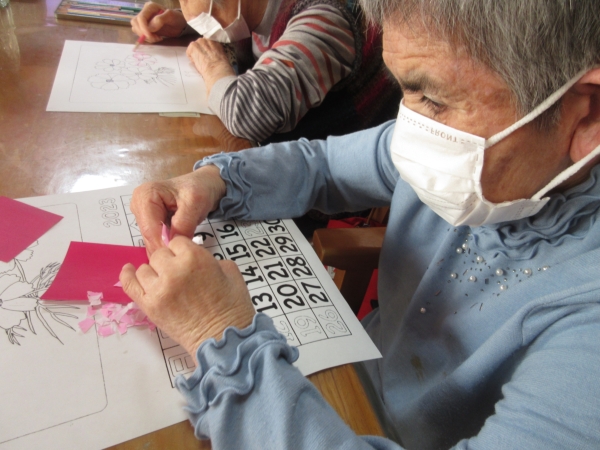色の組み合わせやバランスを考えながら紙を貼りつけていく作業であるため、